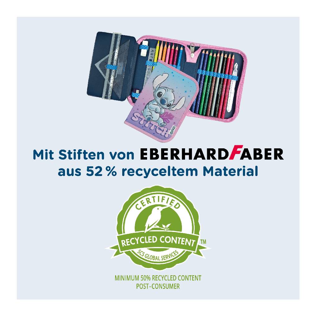 4 háromszög alakú színes ceruzát, 2 háromszög alakú ceruzát, egy radírt, egy 17 cm-es vonalzót, egy hegyezőt, 2 ABC sablont, egy derékszögű vonalzót és egy Stitch órarendet.