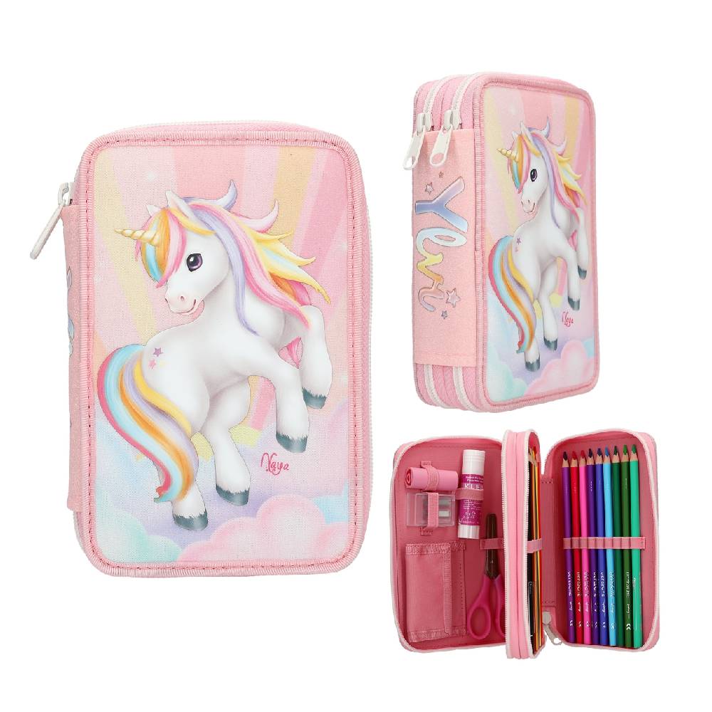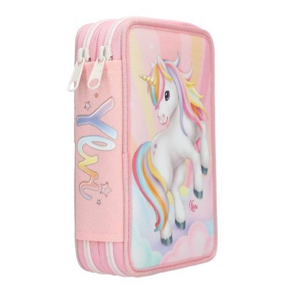az Ylvi rózsaszín tolltartója teljes egészében csillogó anyagból készült, az elején található nagy unikornis motívum pedig csillogó felhőkből és sugarakból álló háttér előtt helyezkedik el.