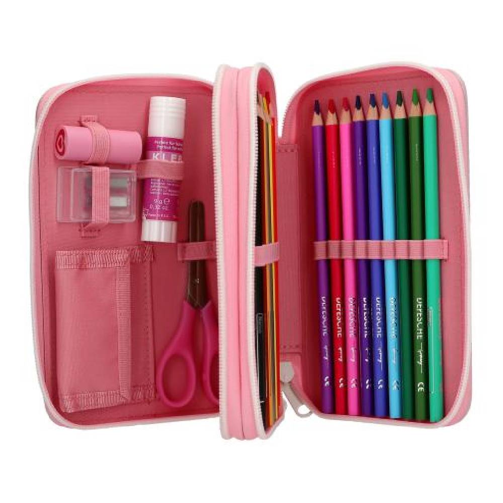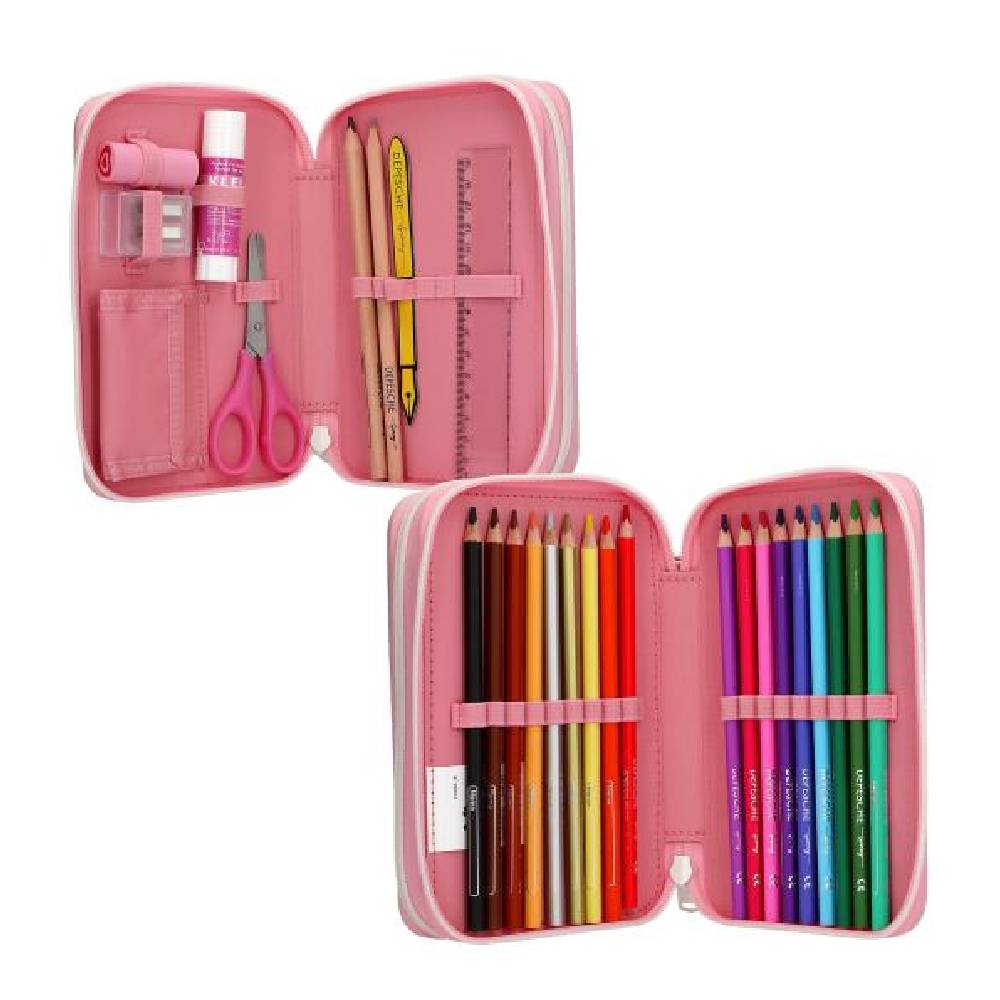 A két különálló cipzáras rekesz 12 színesceruzával, 1 grafit ceruzával, kétlyukú hegyezővel, radírral, vonalzóval, ollóval és ragasztóstifttel van megtöltve.