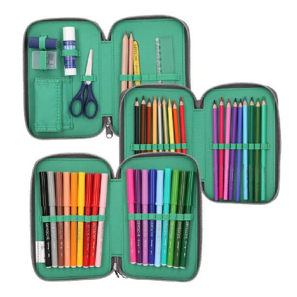 A három különálló rekeszben 18 színesceruza és filctoll, 2 grafitceruza, radír, hegyező, vonalzó, olló és ragasztóstift található
