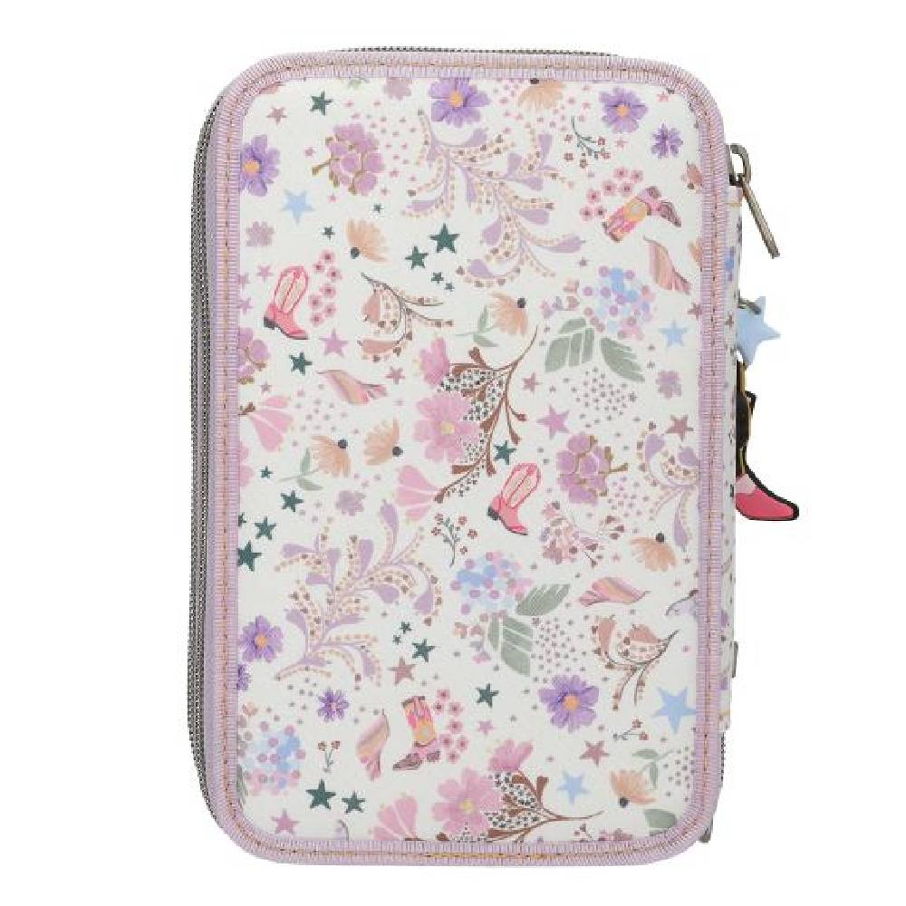 - A krémszínű TOPModel tolltartó halványlila részletekkel, az elején nagyméretű, romantikus modell motívummal díszített