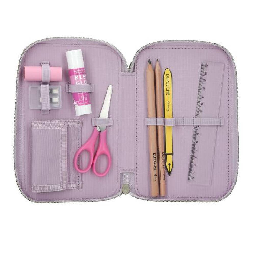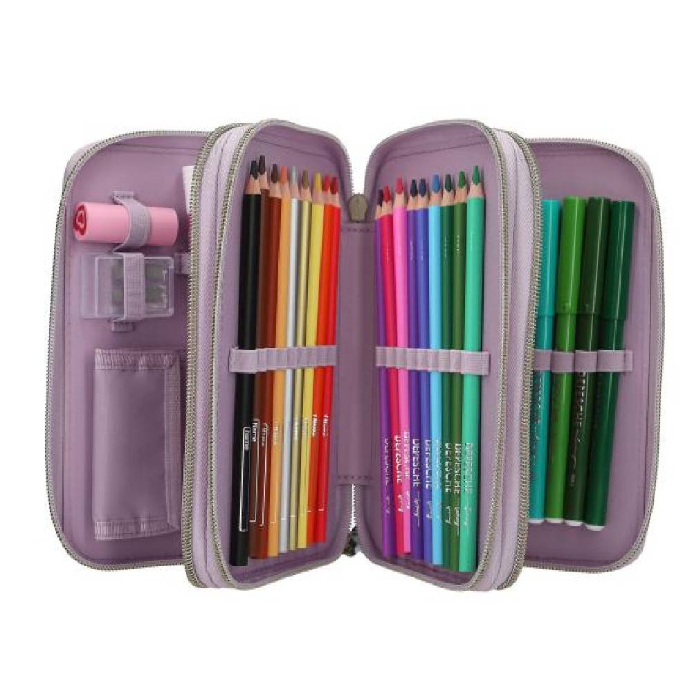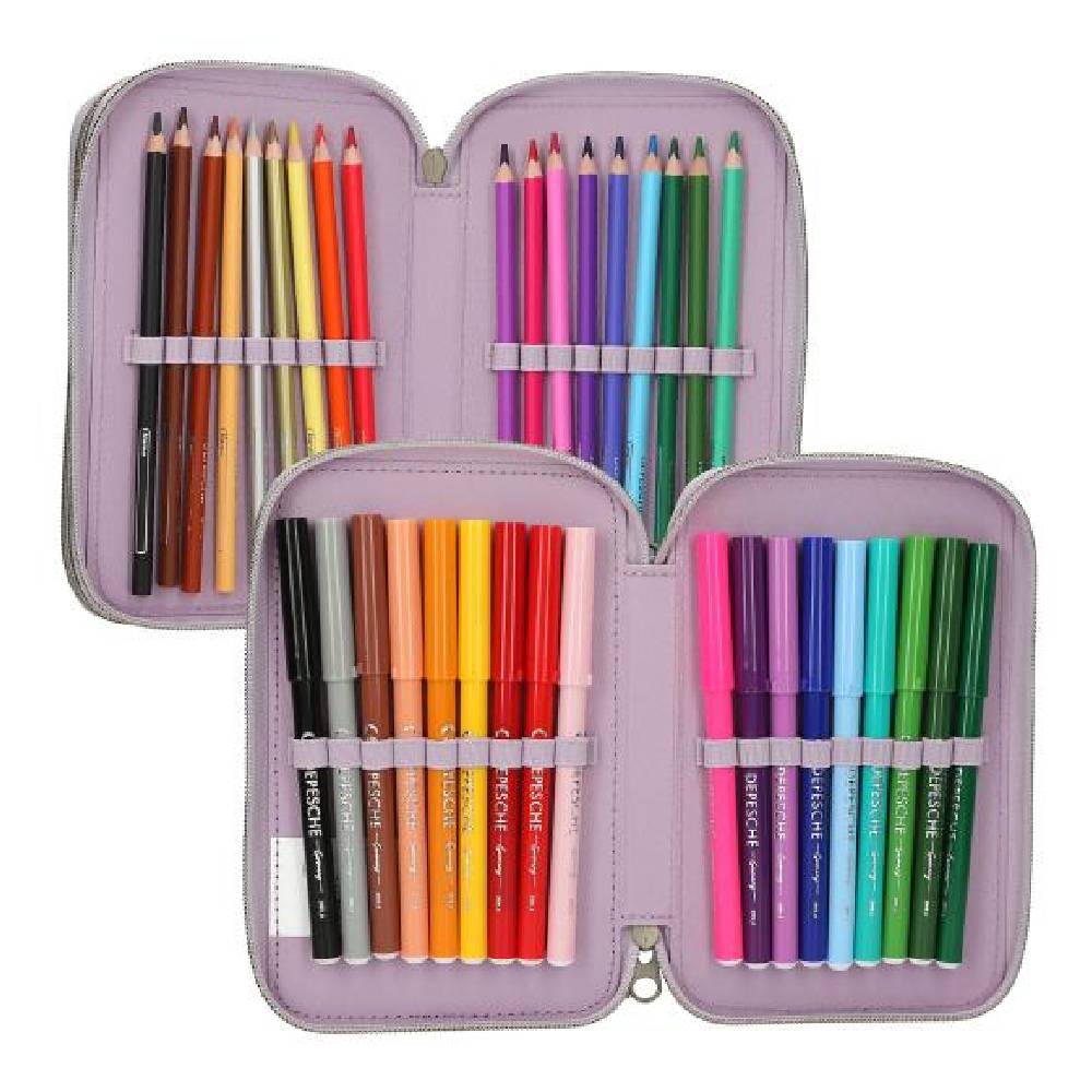 - A három különálló rekeszben 18 színesceruza és filctoll, 2 grafitceruza, radír, hegyező, vonalzó, olló és ragasztóstift található