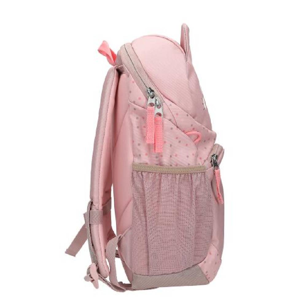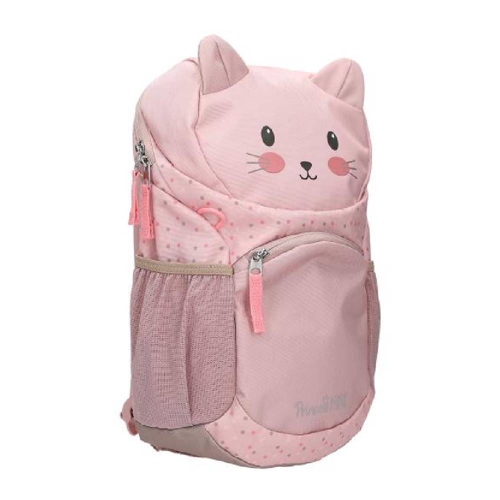 A bájos, rózsaszínű, cicát formázó hátizsák, applikált fülekkel, aranyos cicafejjel és imádnivaló pöttyös mintával készült