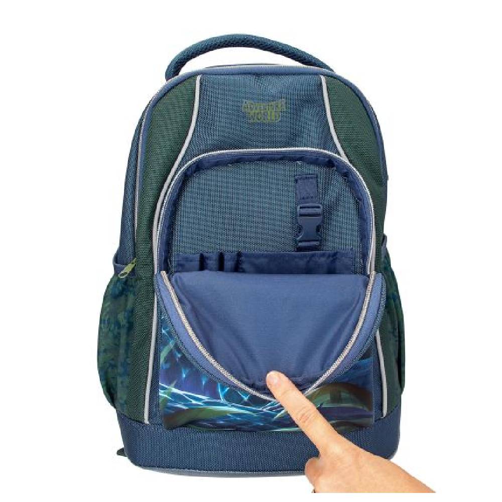 Az Adventure World sötétkék-zöld iskolai hátizsákjának elülső zsebét egy sötét kígyó lenyűgöző tekintete díszíti.