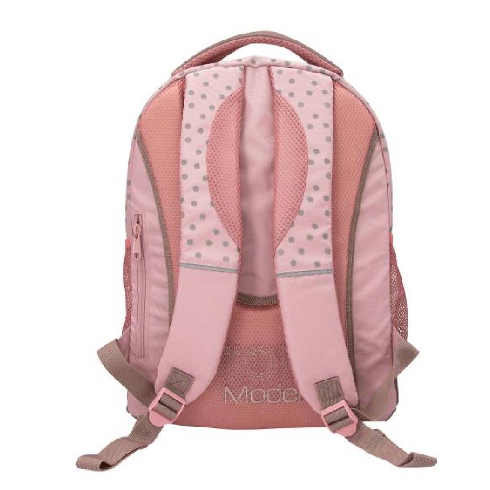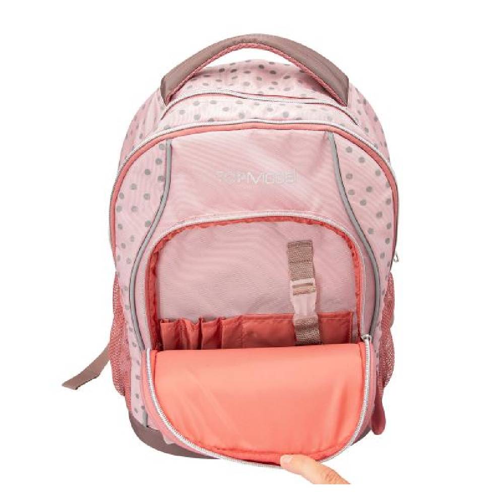 A TOPModel DOTS kollekció rózsaszín iskolatáskája szürke pöttyös mintával igazán figyelemfelkeltő, miközben kényelmes és jól átgondolt kialakításának köszönhetően ideális választás az iskolai mindennapokhoz.