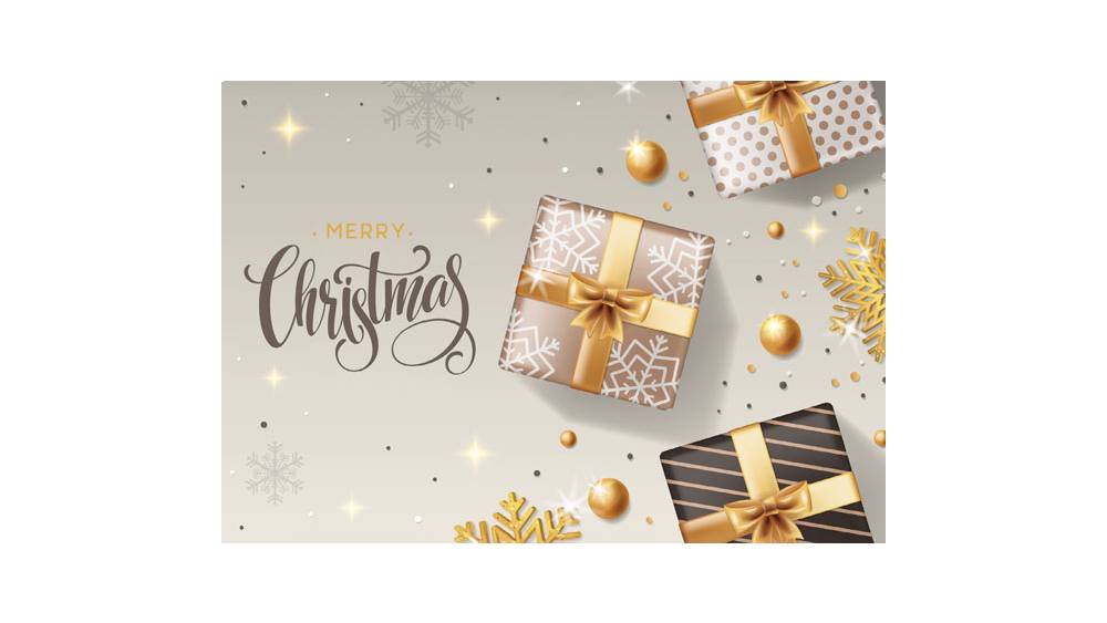 A képen arany színű szalaggal átkötött ajándékdobozok látható