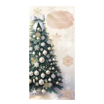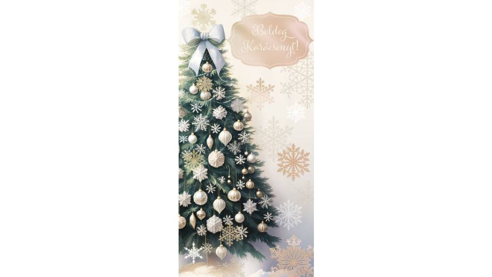 Elegáns karácsonyi üdvözlőlap, belső szöveg: három nyelvű karácsonyi üdvözlet, álló méret