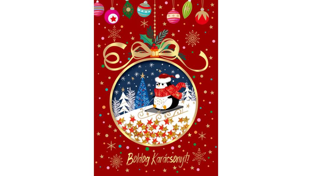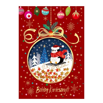 Kedves karácsonyi üdvözlőlap, szánkózó pingvinnel, kinyitható, belső szöveg nélkül, álló méret