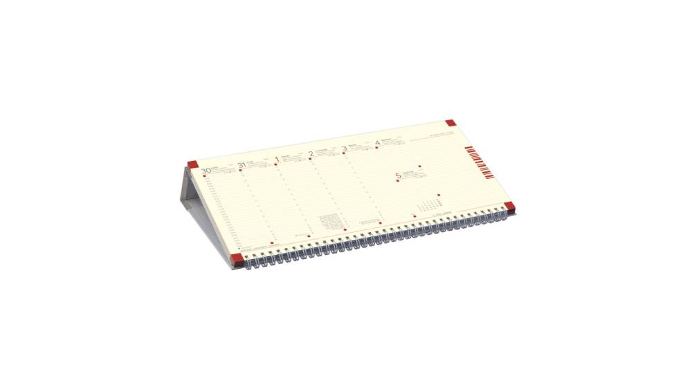 - Fekvő tartóval (a gerincen olasz műbőrrel) forgalmazott chamois (krémszínű) tömbös, asztali naptár, perforált jegyzetrésszel