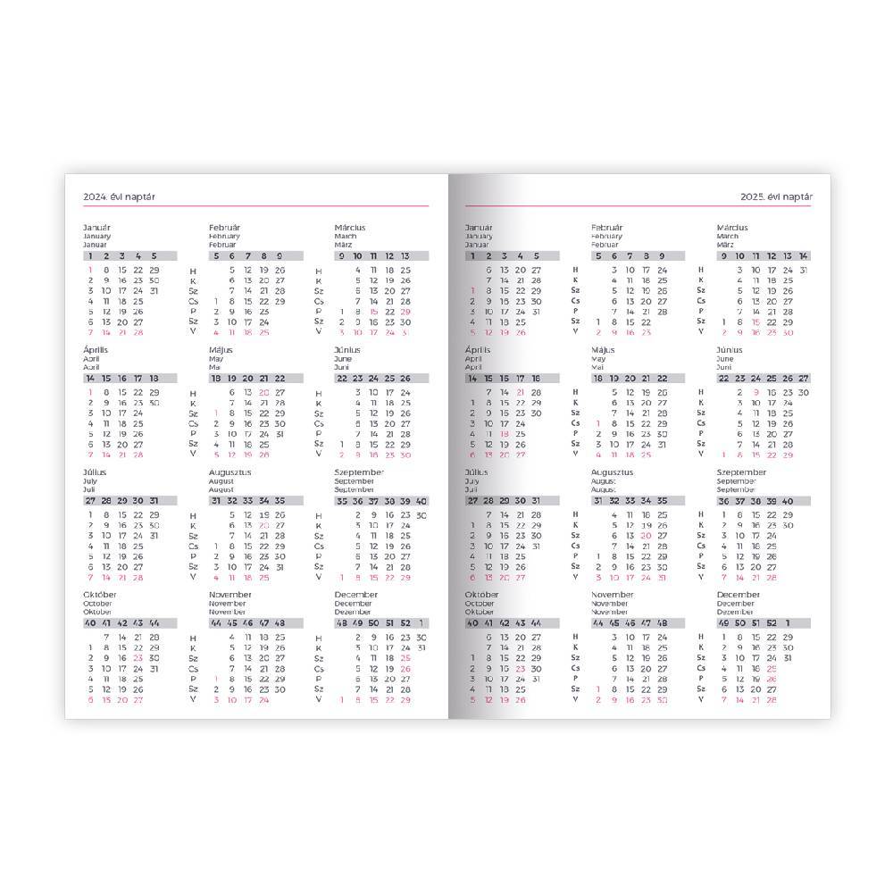 B5 méretű, szivacsos borítójú, heti bontású hatéridőnapló