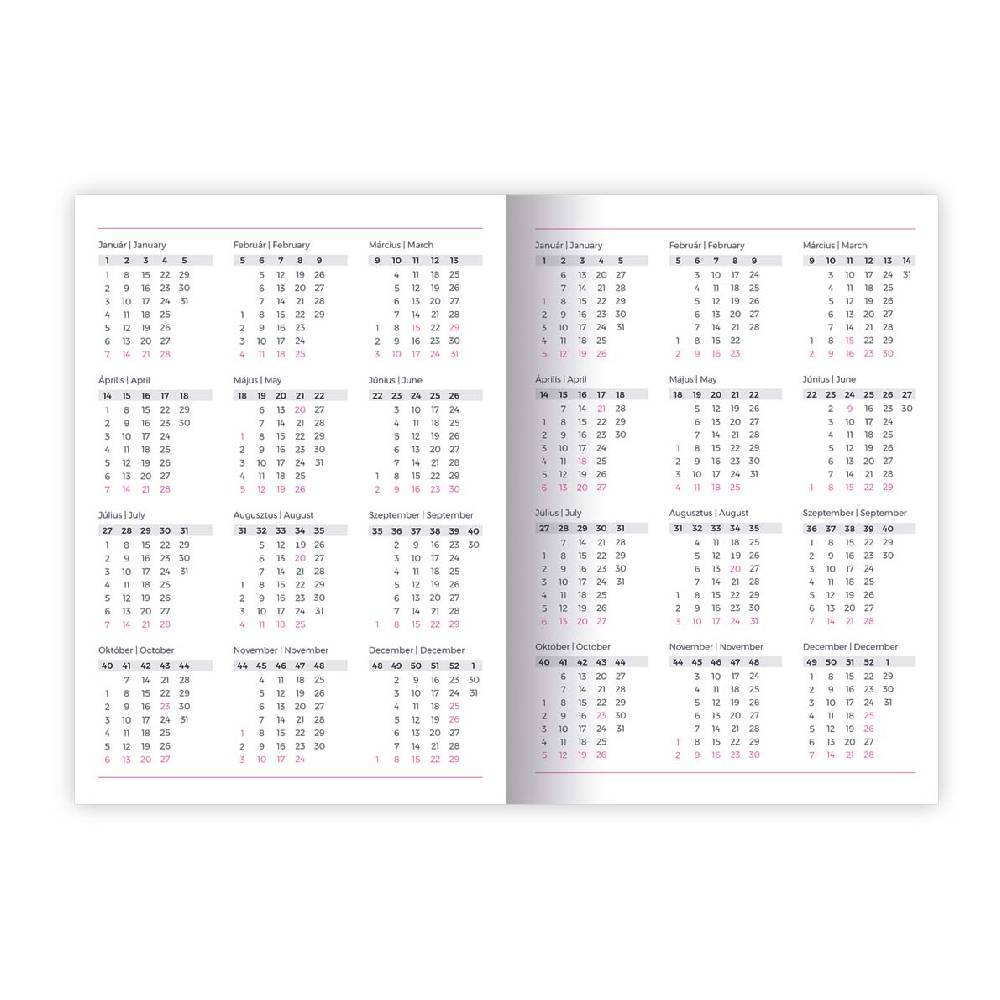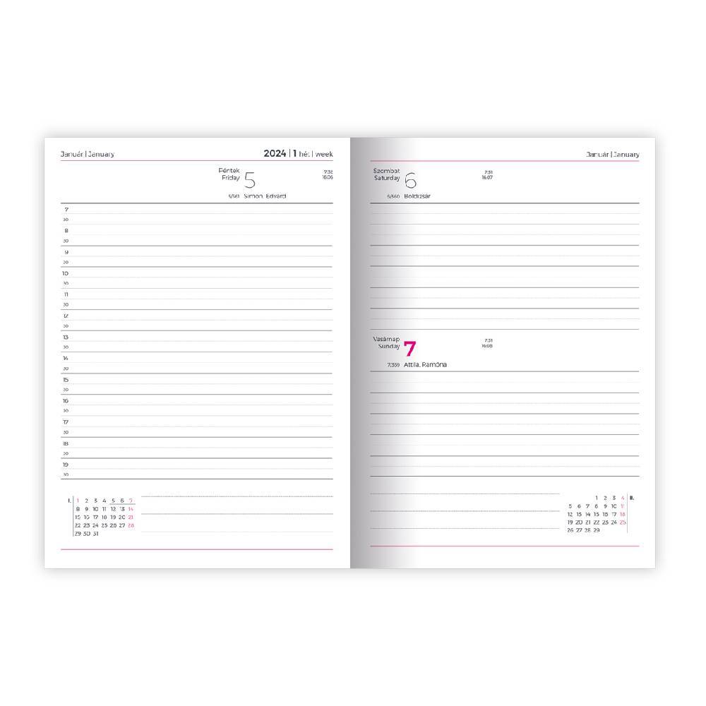 A5 méretű, szivacsos borítójú, napi bontású határidőnapló