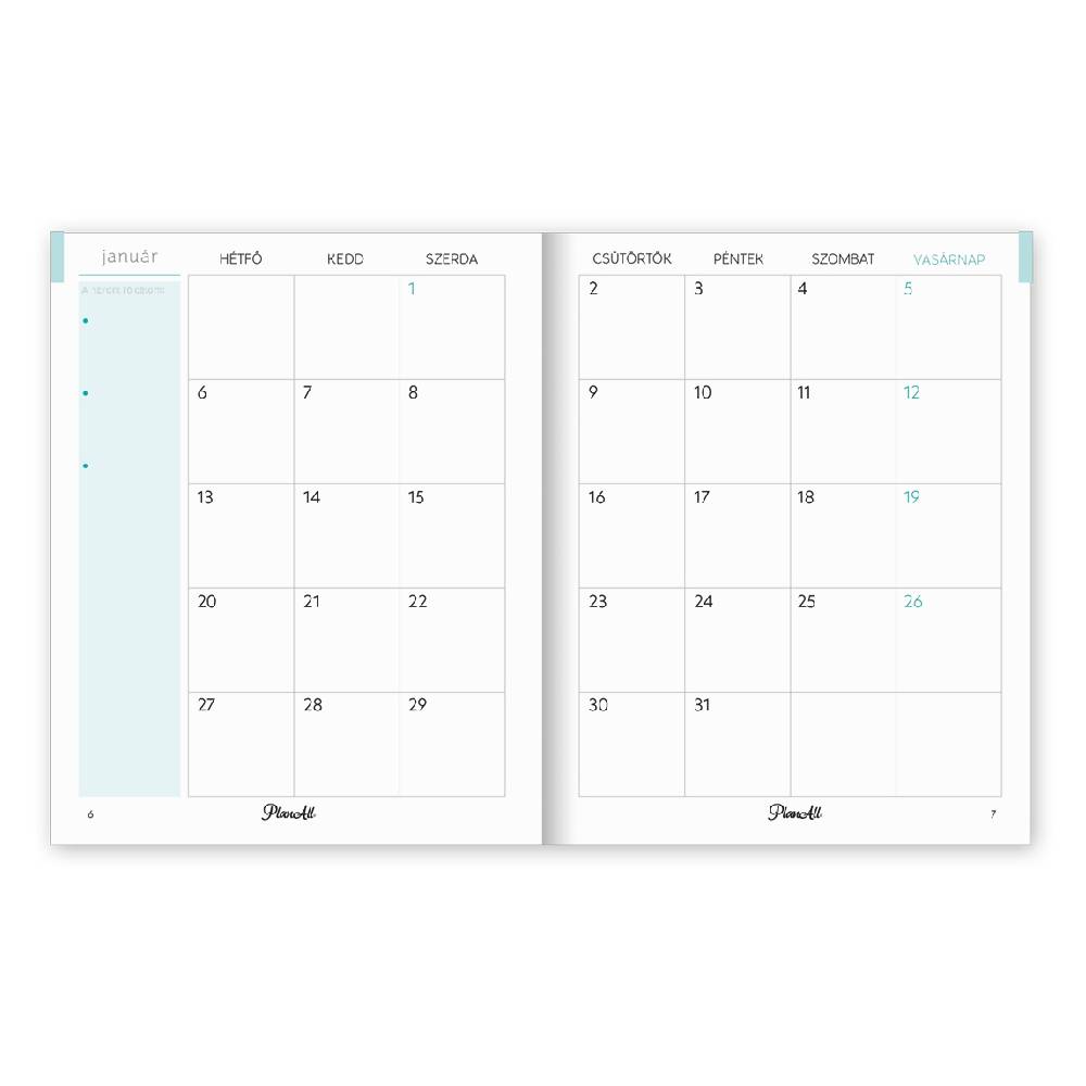 - A6 méretű, keményfedeles, aranyozott, heti bontású zsebnaptár