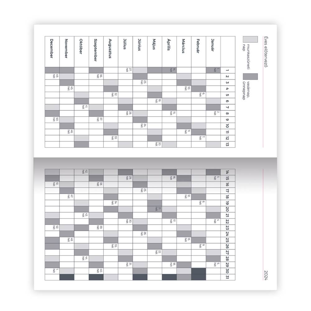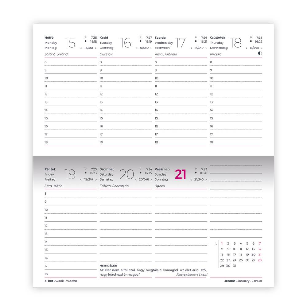 Kemémyfedeles, hosszúkás, heti bontású zsebnaptár
