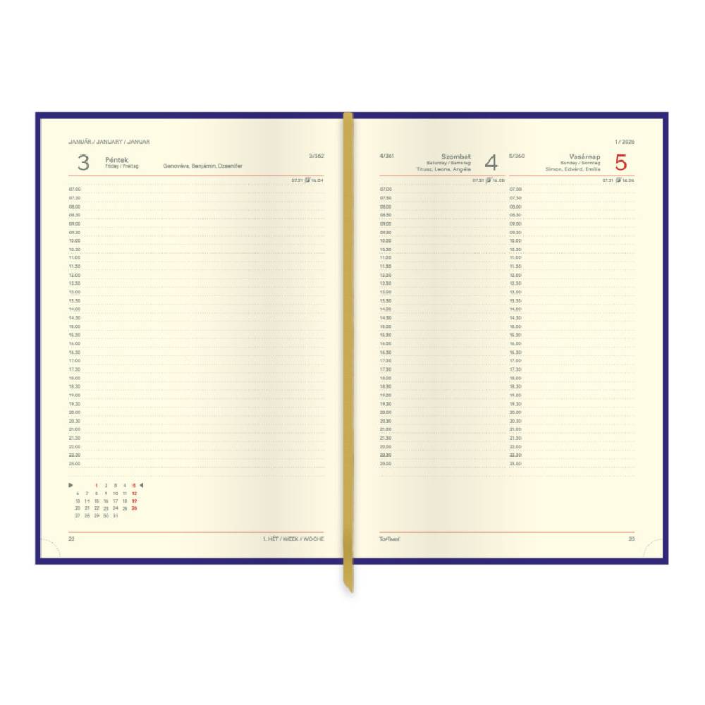- A praktikus A5 méret kényelmesen elfér táskában vagy aktatáskában, ugyanakkor bőséges helyet biztosít a mindennapi jegyzeteknek, időpontoknak és teendőknek