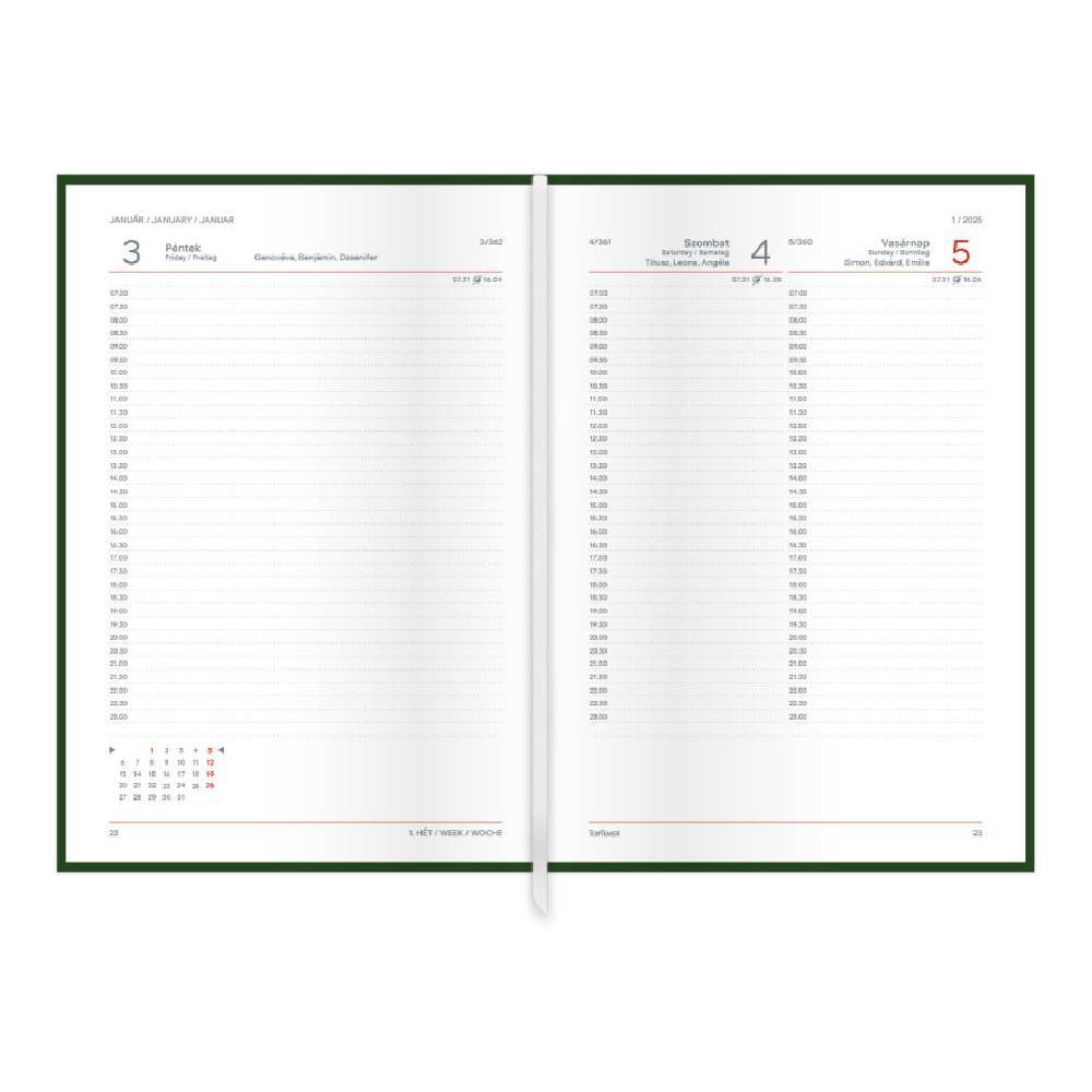 - A praktikus A5 méret kényelmesen elfér táskában vagy aktatáskában, ugyanakkor bőséges helyet biztosít a mindennapi jegyzeteknek, időpontoknak és teendőknek