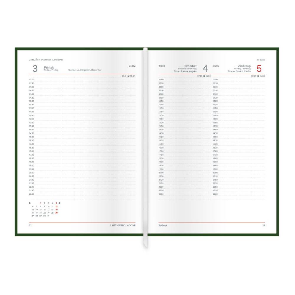 - A praktikus A5 méret kényelmesen elfér táskában vagy aktatáskában, ugyanakkor bőséges helyet biztosít a mindennapi jegyzeteknek, időpontoknak és teendőknek