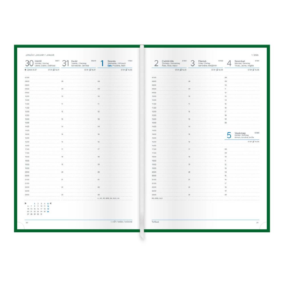 - Heti beosztás (egy oldalpár egy hét napjai), félórás időintervallumok 7–23 óráig