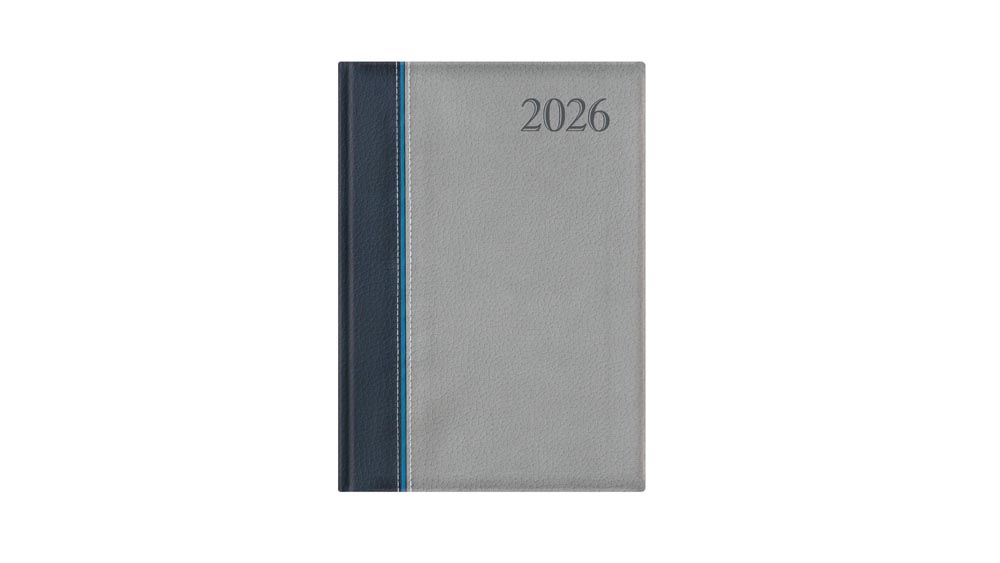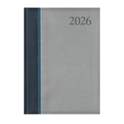 A TopTimer Groowy naptárcsaládja háromféle szín kombinációjával, kék díszcsíkkal, fehér díszvarrásokkal készült, bőrhatású, kemény fedéllel.