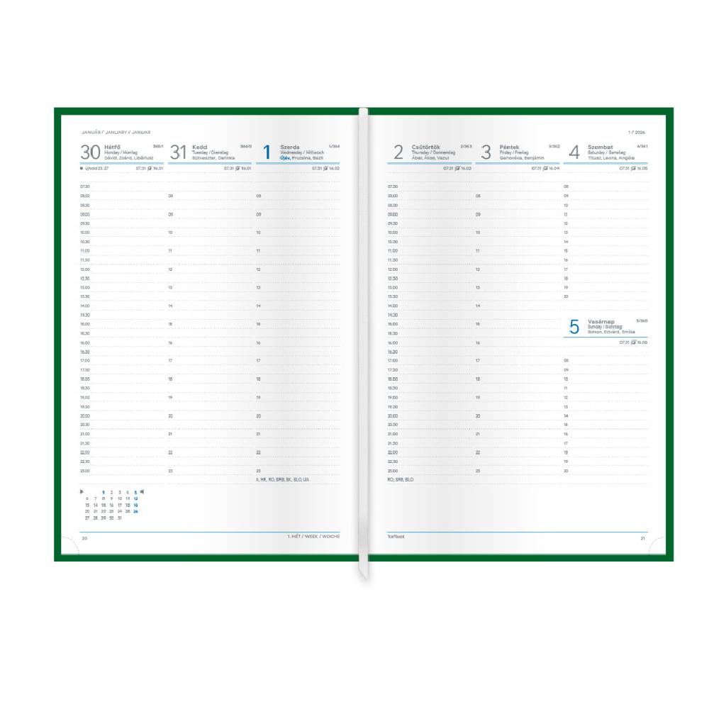 - Heti beosztás (egy oldalpár egy hét napjai), félórás időintervallumok 7–23 óráig