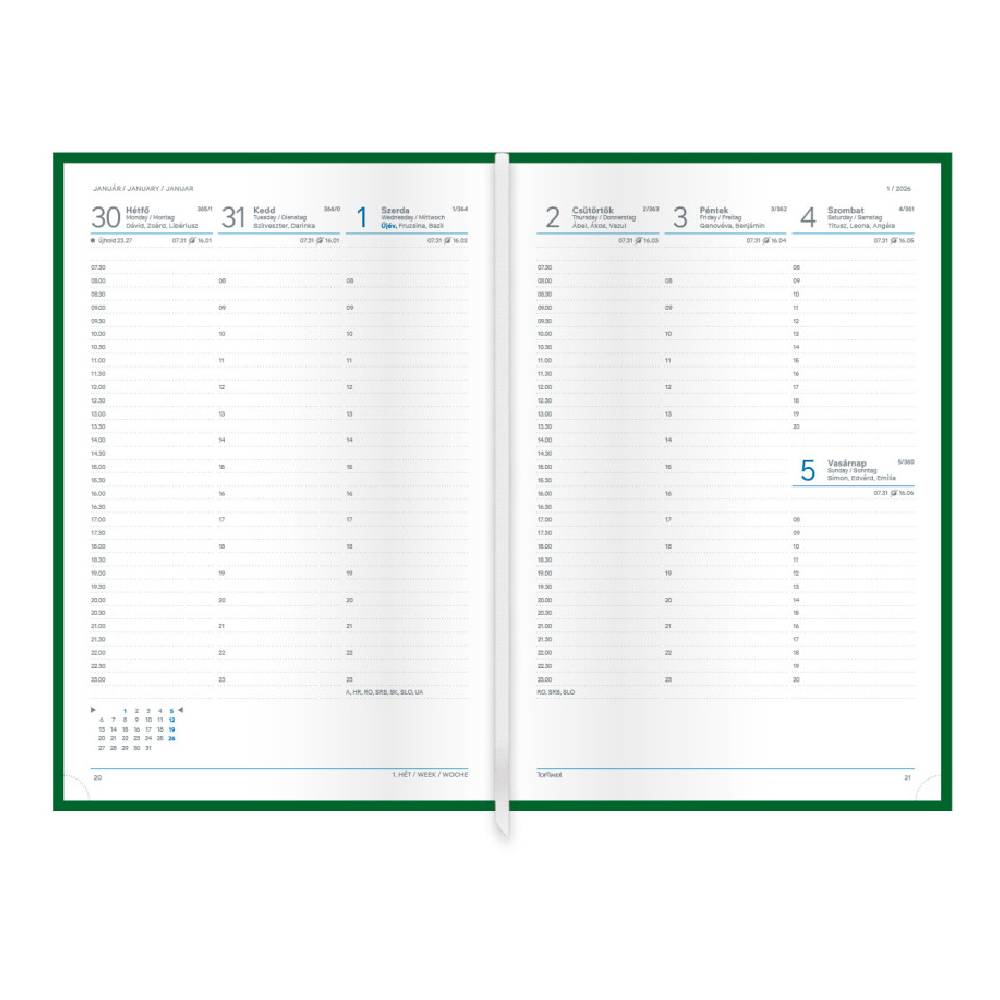 - Heti beosztás (egy oldalpár egy hét napjai), félórás időintervallumok 7–23 óráig