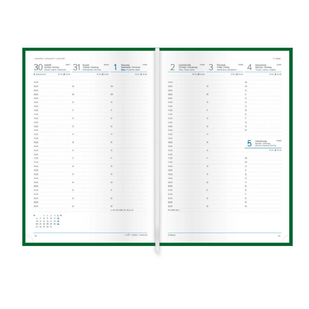 - Extra tartalom: éves és havi áttekintők, névnapok, pirkadat- és alkonykezdetek, holdfázisok, nemzetközi ünnepnapok, színes térkép Budapestről és Magyarországról, 16 oldal jegyzetelésre, 2026. és 2027. évi összesített naptár