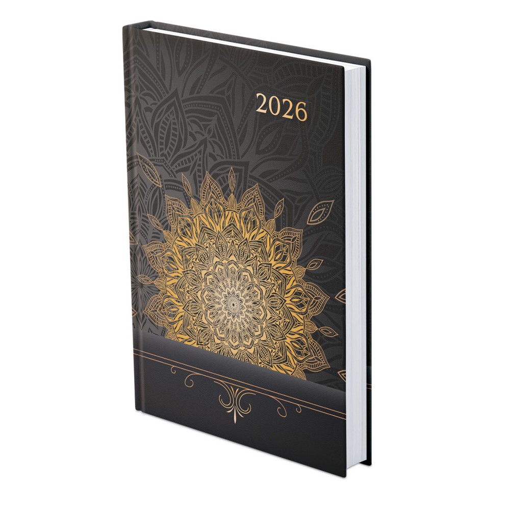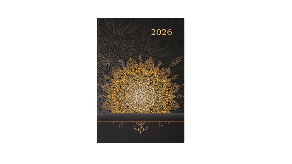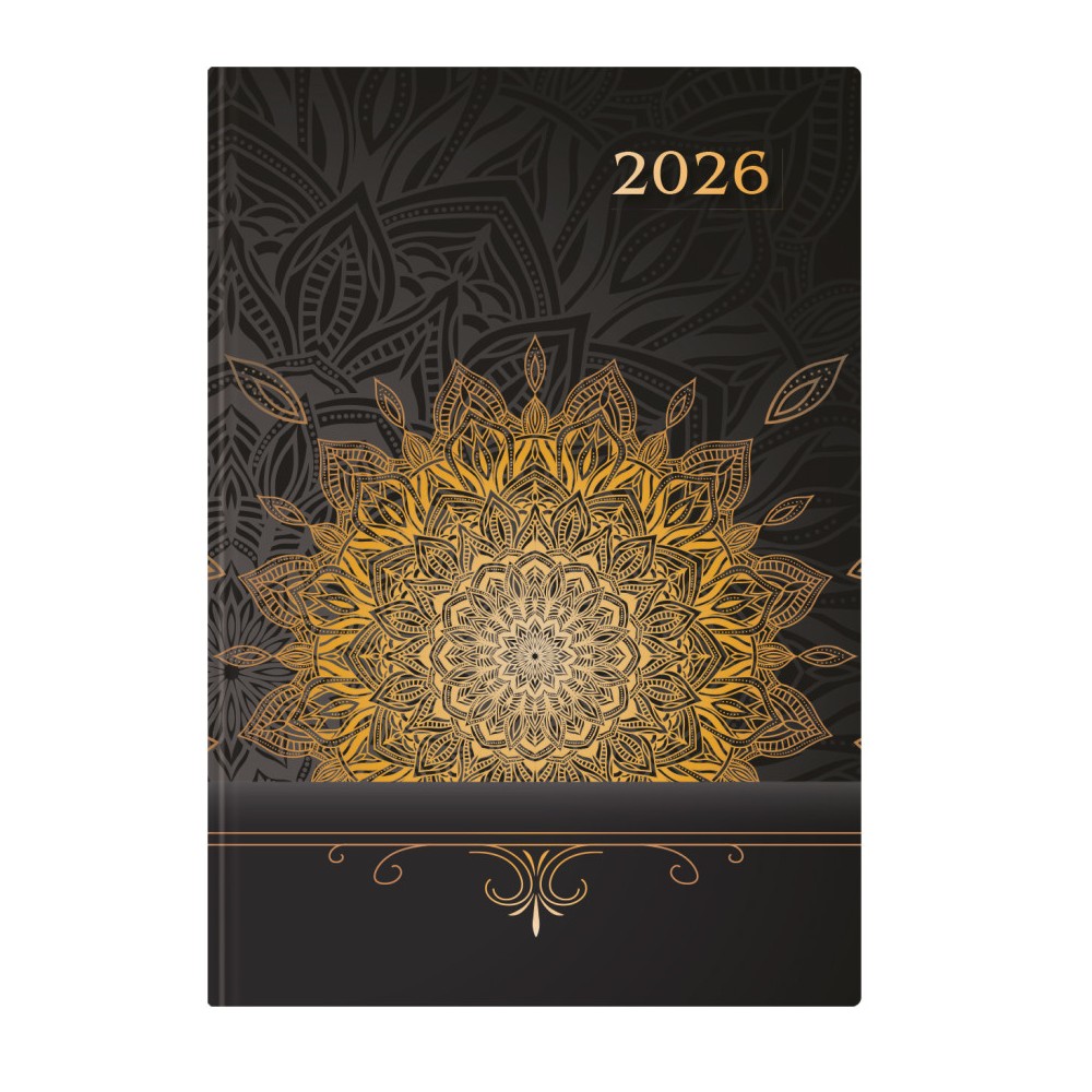 Ezt az elegáns megjelenésű, szép tervezőt részletgazdag mandala-ábra díszíti, melyet a fekete és az aranysárga szín kontrasztja még hangsúlyosabbá tesz.