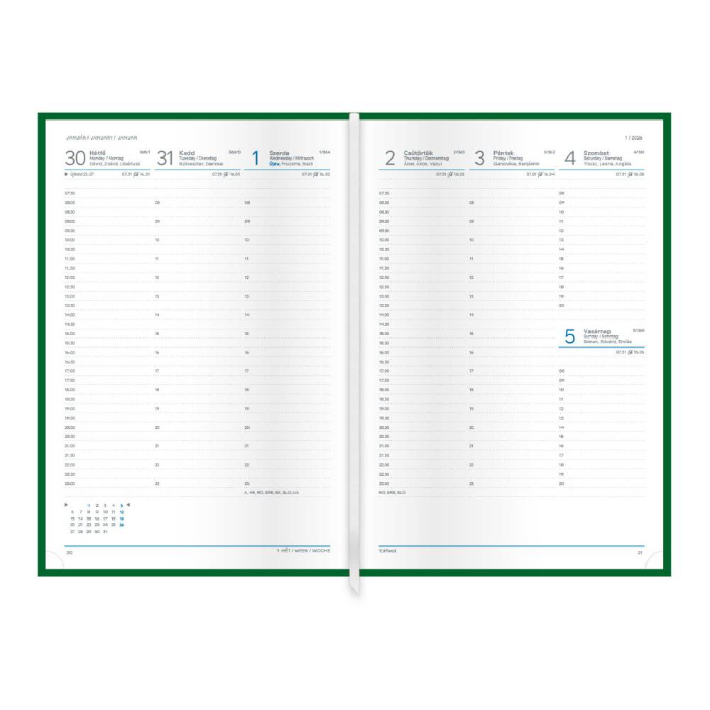 - Heti beosztás (egy oldalpár egy hét napjai), félórás időintervallumok 7–23 óráig