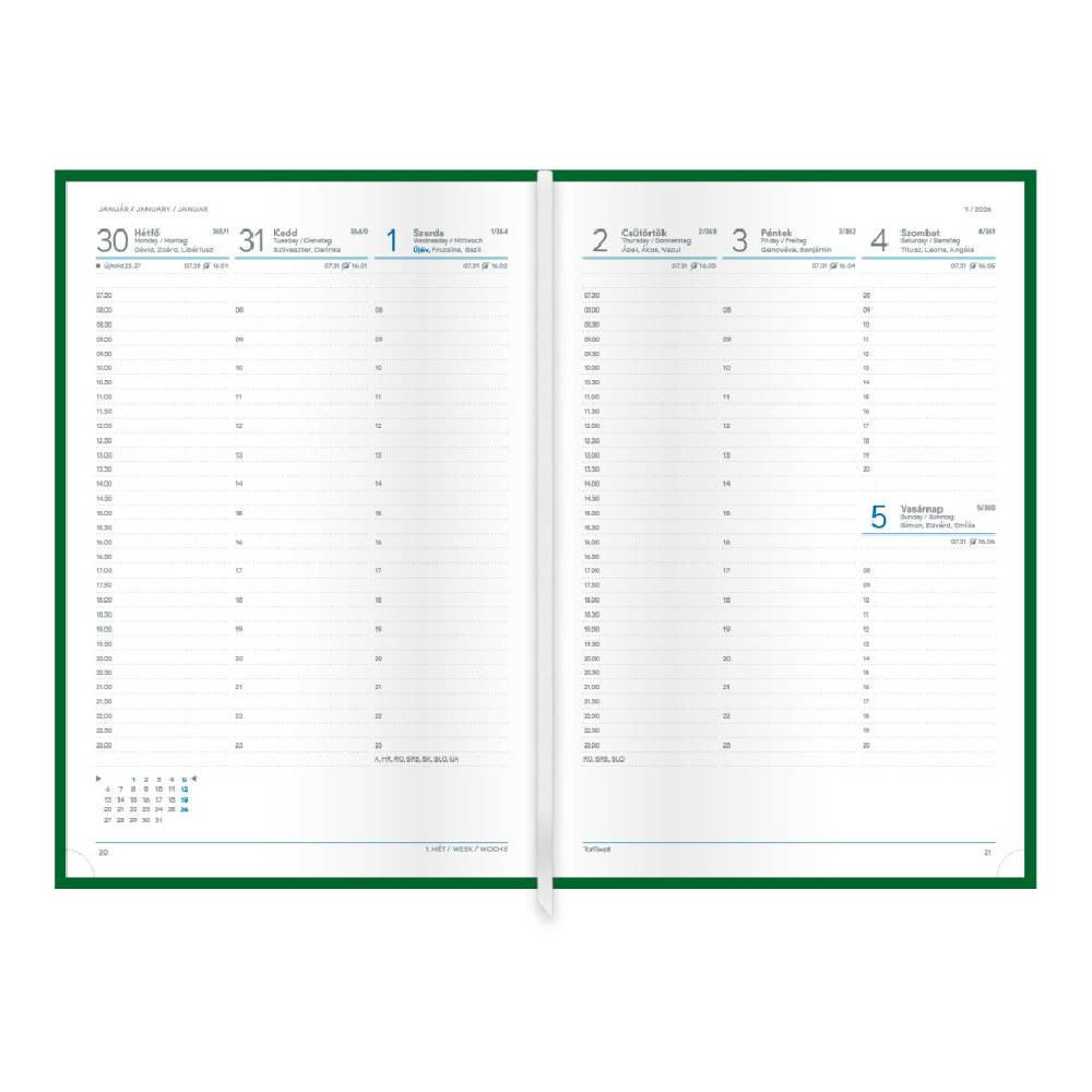 - Heti beosztás (egy oldalpár egy hét napjai), félórás időintervallumok 7–23 óráig