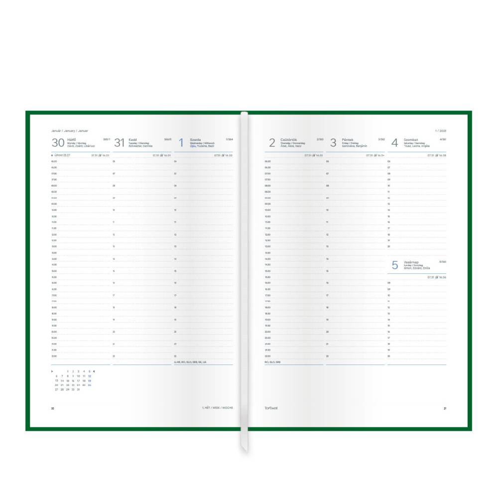 - Heti beosztás (egy oldalpár egy hét napjai), félórás időintervallumok 5–23 óráig