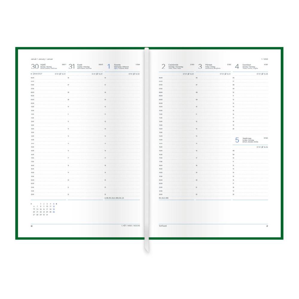 - Heti beosztás (egy oldalpár egy hét napjai), félórás időintervallumok 5–23 óráig