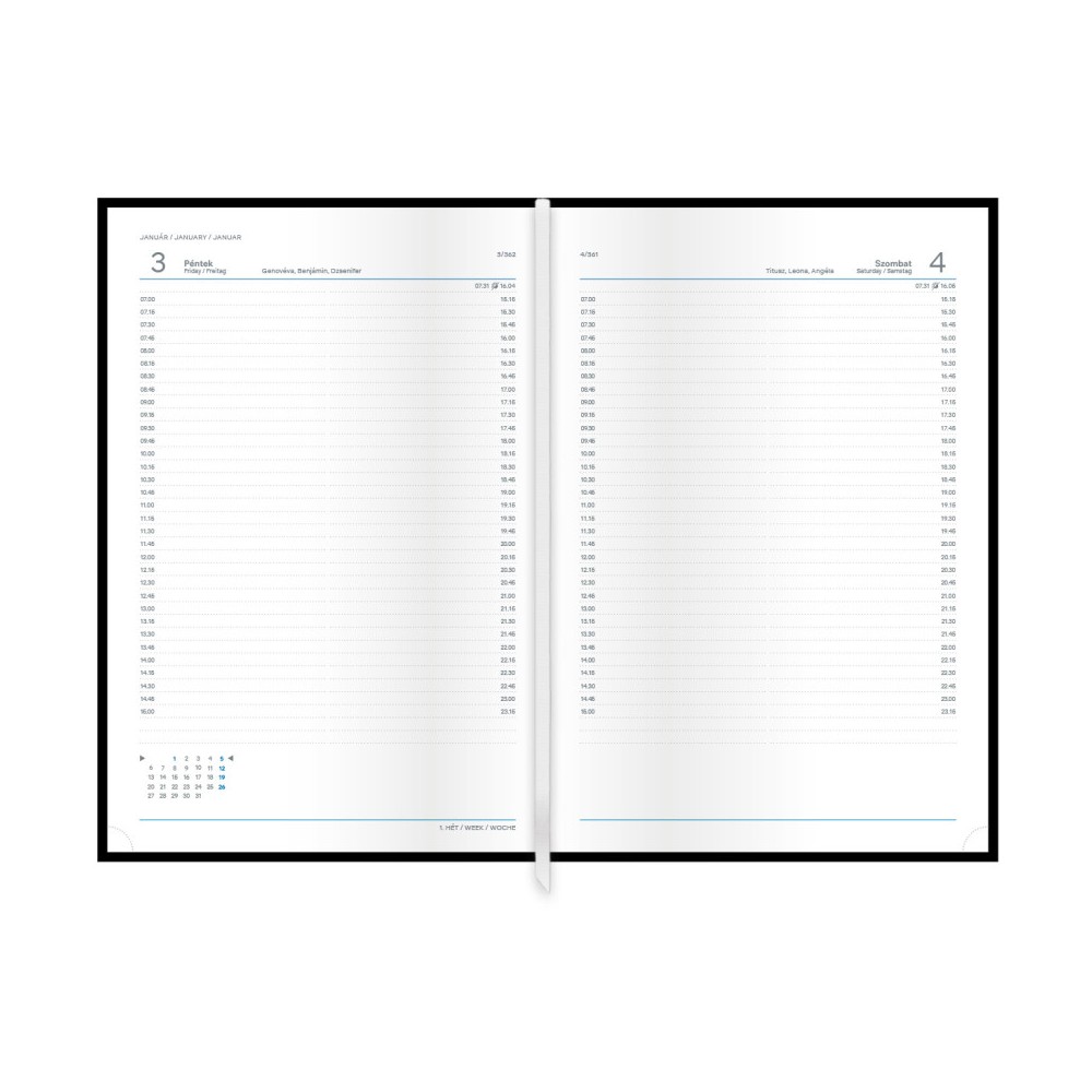 - a napokon belül 07.00 és 23.15 között negyedórás időközökkel jelöltük az időpontokat, így messzemenően pontosan feljegyezheti napi teendőit