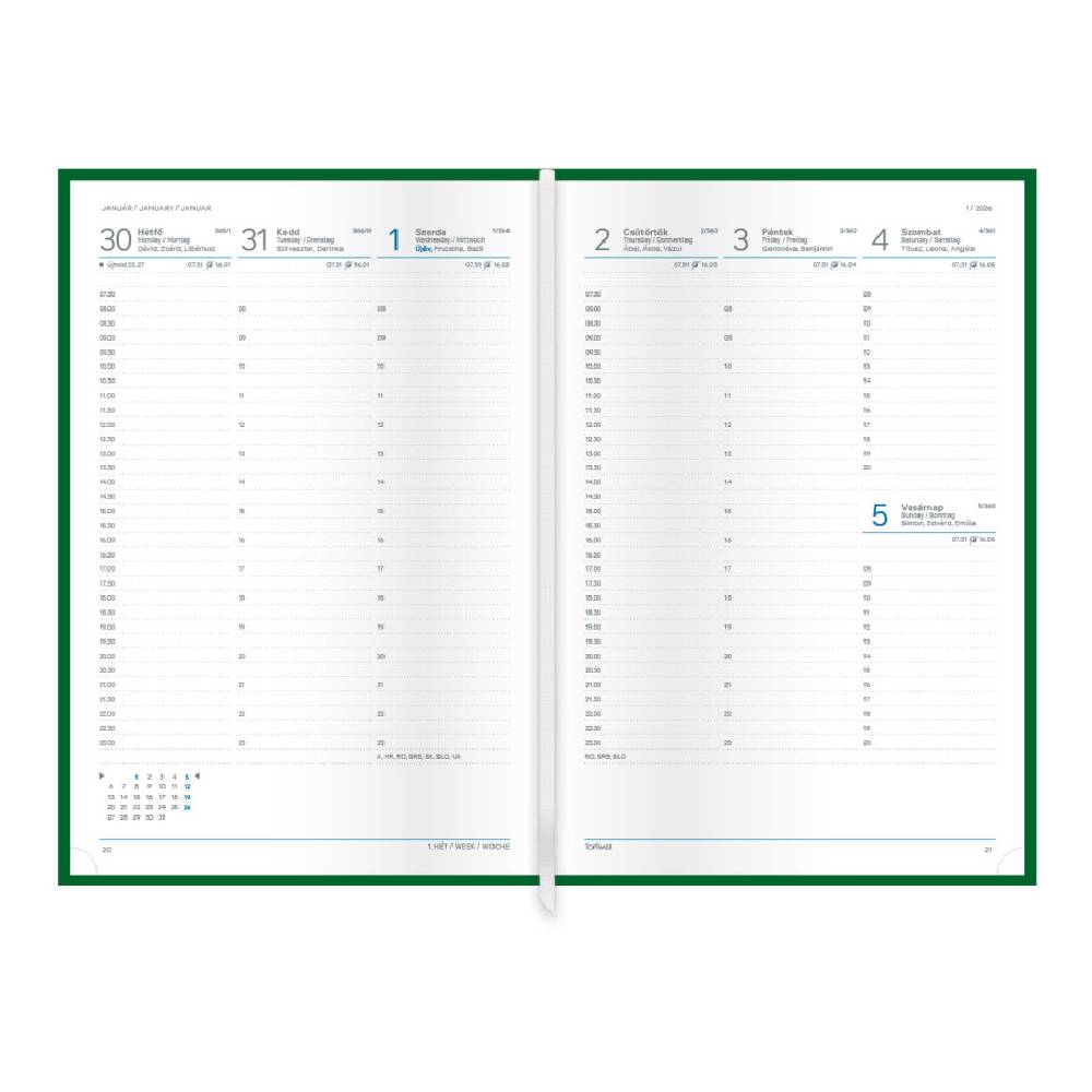 - Heti beosztás (egy oldalpár egy hét napjai), félórás időintervallumok 7–23 óráig