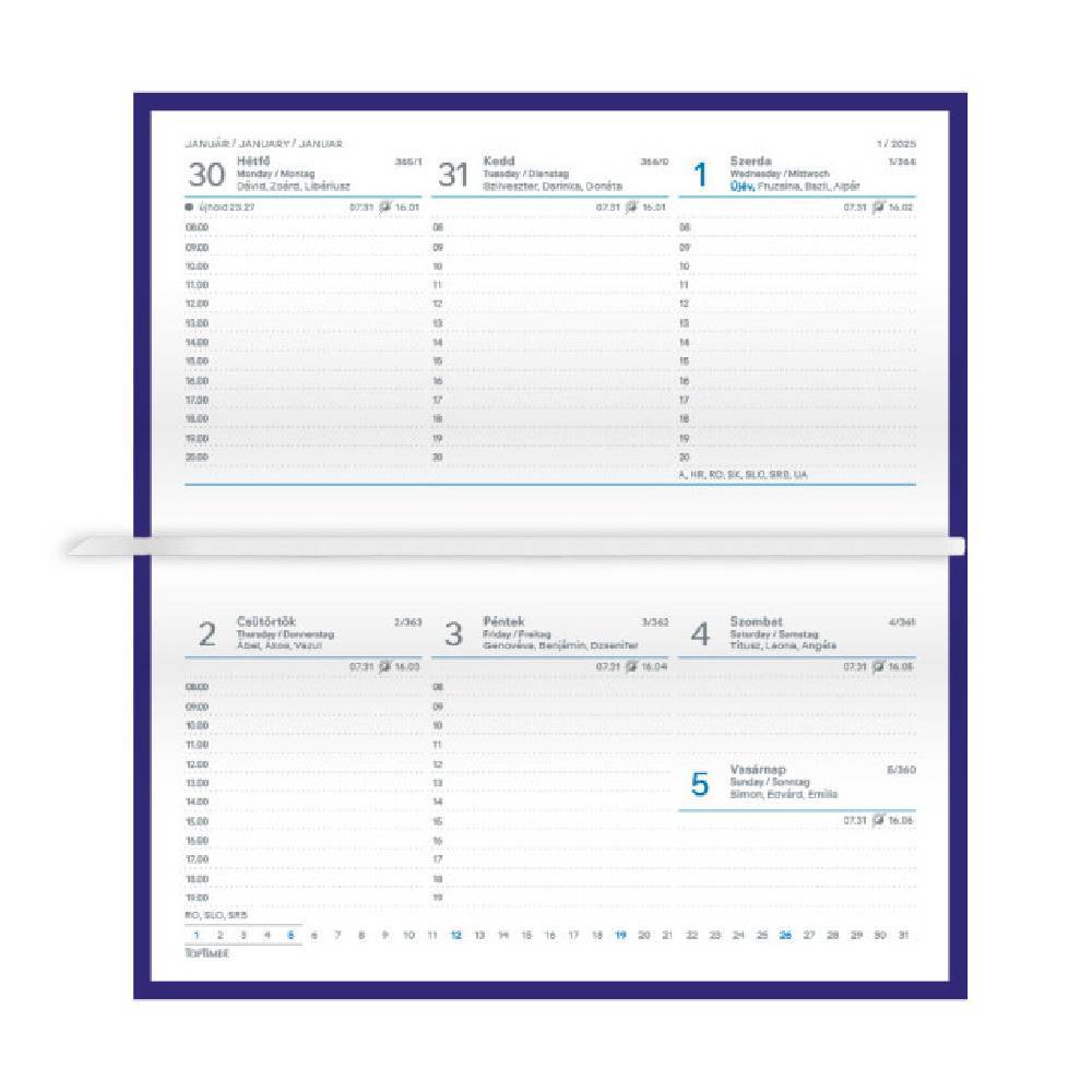 - Belső kialakítás: a fehér papírblokk heti beosztással készült, így egy oldalpár egy hét napjait foglalja magába