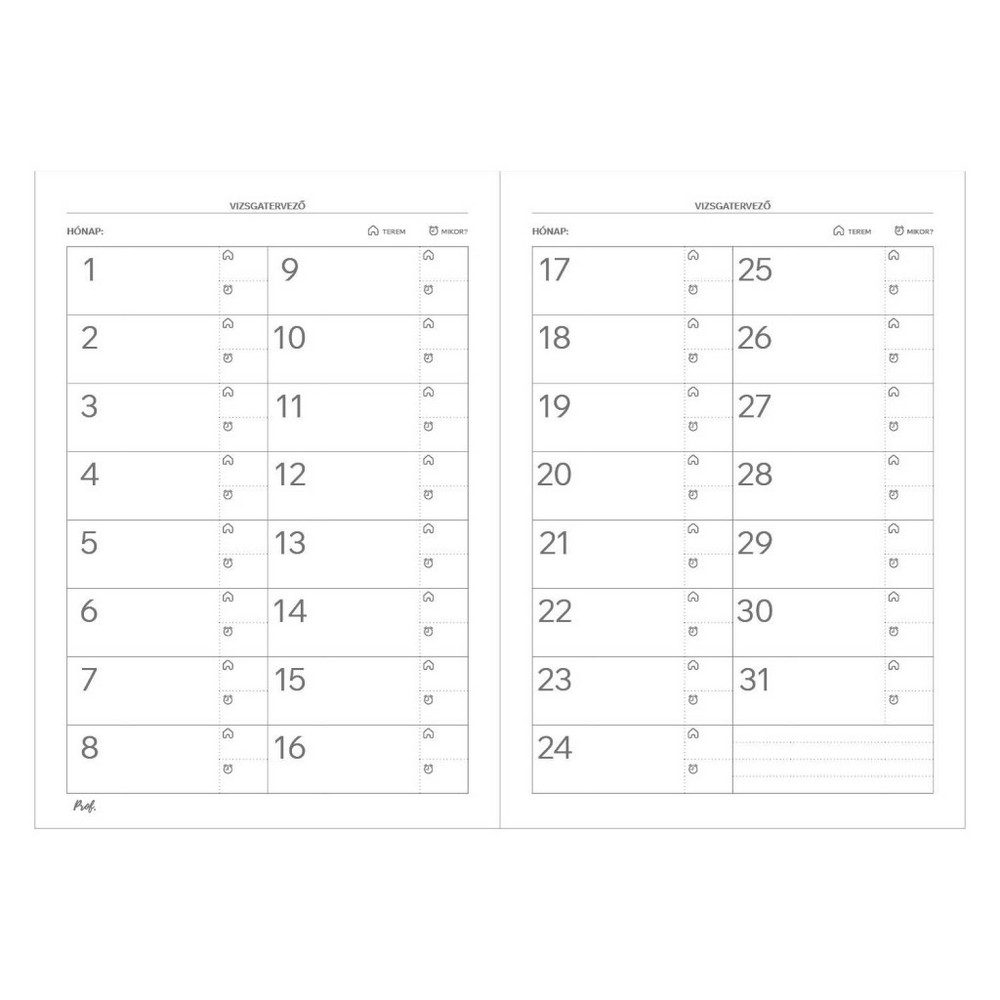 Kiegészítő lapok: a naptár elejére visszakerült az órarend, vizsgatervező, tervek, célok.