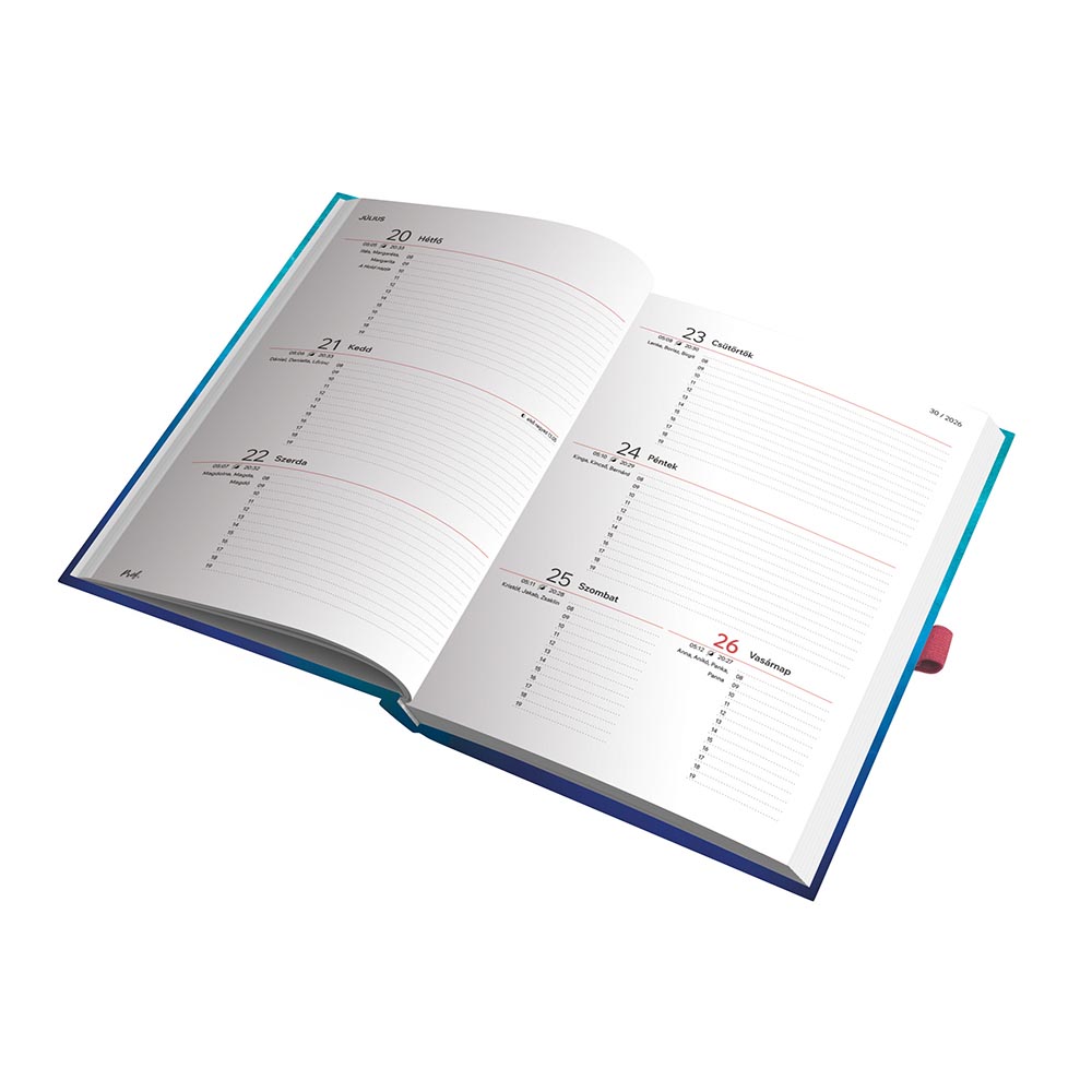 Belső kialakítás: a fehér papírblokk heti beosztással készült, így egy oldalpár egy hét napjait foglalja magában.