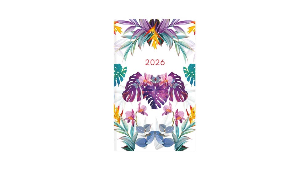 A TopTimer Joy naptárcsaládjának tagjai színes képekkel, mintákkal díszített kemény borítóval készülnek. Ezen a naplófedélen kellemes, pasztell színekkel ábrázolt, trópusi növények láthatók.
