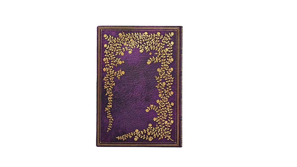 A bőrhatású, lila felületet finom, filigrán arany keretben virágzó rózsaágak díszítik.