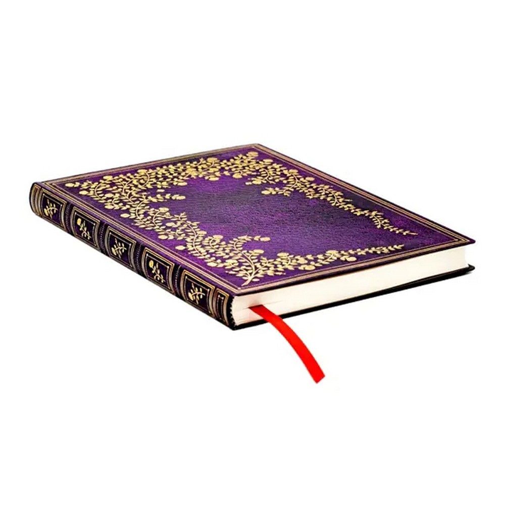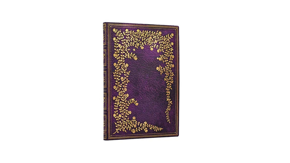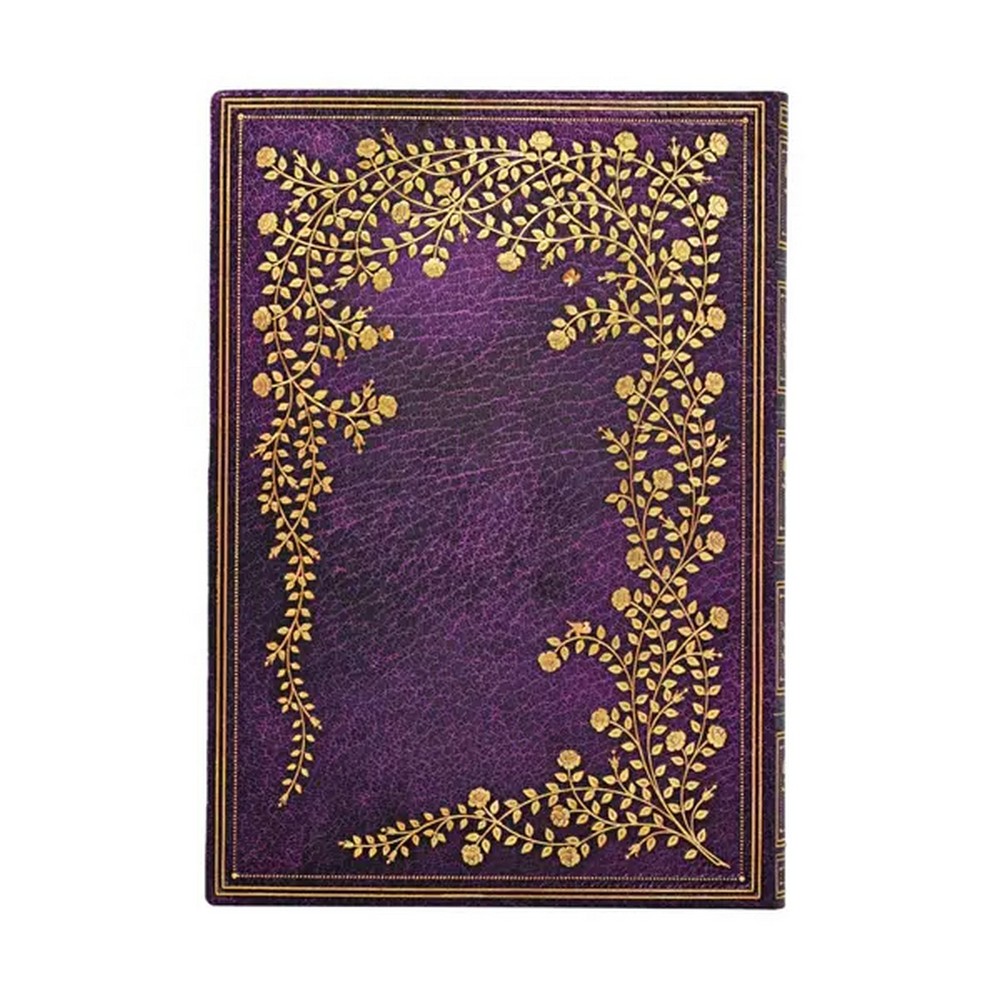 A bőrhatású, lila felületet finom, filigrán arany keretben virágzó rózsaágak díszítik.