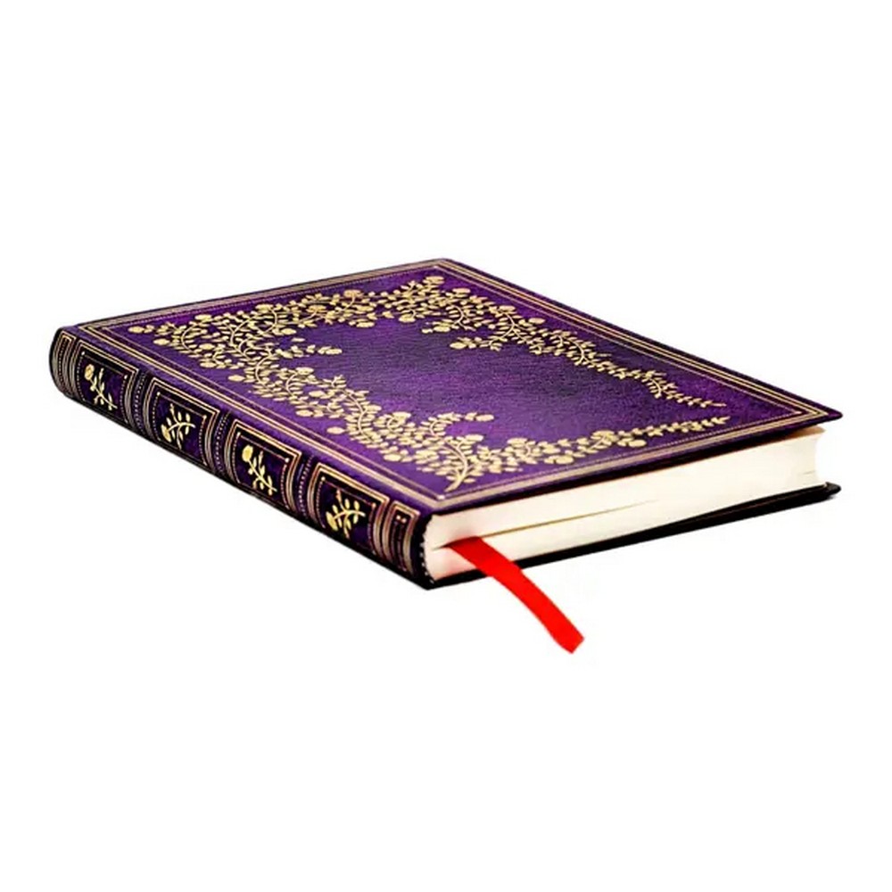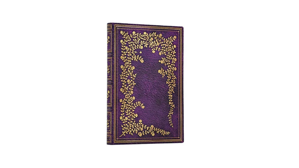 A bőrhatású, lila felületet finom, filigrán arany keretben virágzó rózsaágak díszítik.