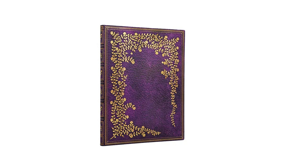 A bőrhatású, lila felületet finom, filigrán arany keretben virágzó rózsaágak díszítik.