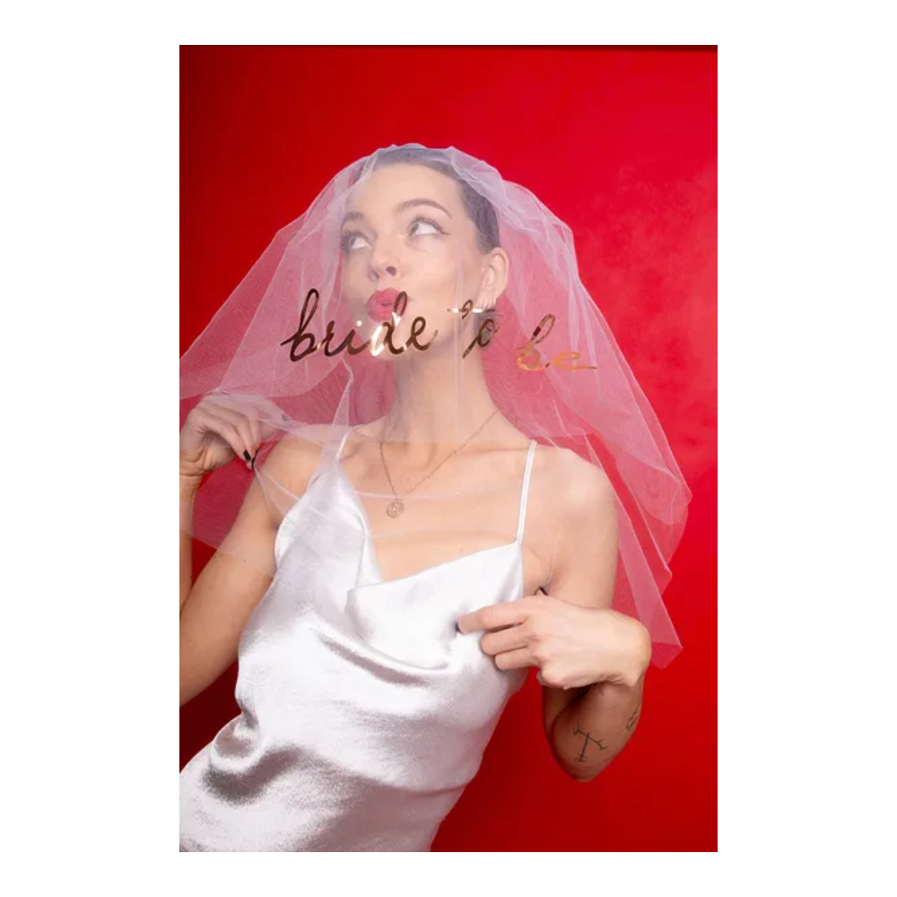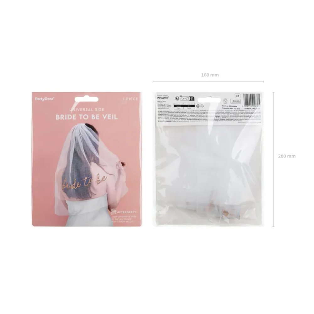 Party Deco menyasszonyi fátyol, fehér, Bride to beFehér fátyol rózsaarany színű „Bride to be” felirattal. Hossz kb. 63 cm