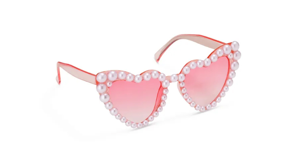 Szív alakú szemüveg gyöngyökkel, rózsaszín színben.